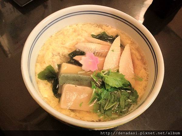 我的麵先上桌,清爽的竹筍、海帶、麻薯和蛋花,