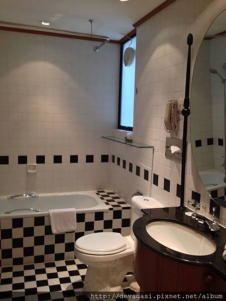 外頭的木質設計配上黑白對比的浴室真是一絕,