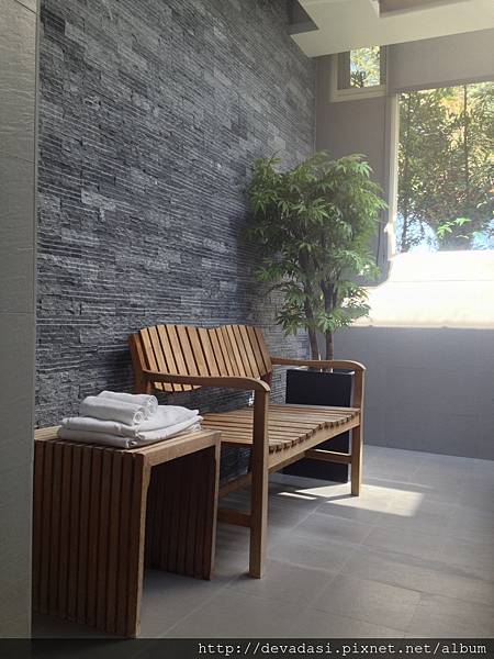 浴池的對面是木椅及木架,