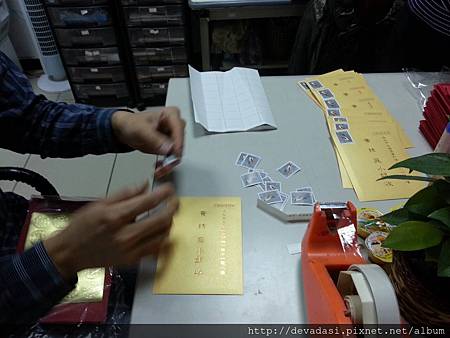 Mr.T在喜帖印好的下午,為了回函貼郵票中。